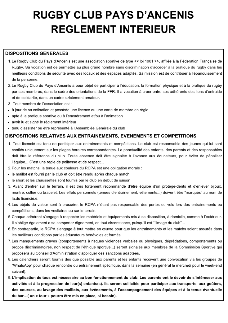 Charte Lire la Charte du Club Règlement Intérieur Lire le Règlement Intérieur CHARTE D’ETHIQUE ET DE DÉONTOLOGIE DU RUGBY FRANÇAIS Lire la Charte